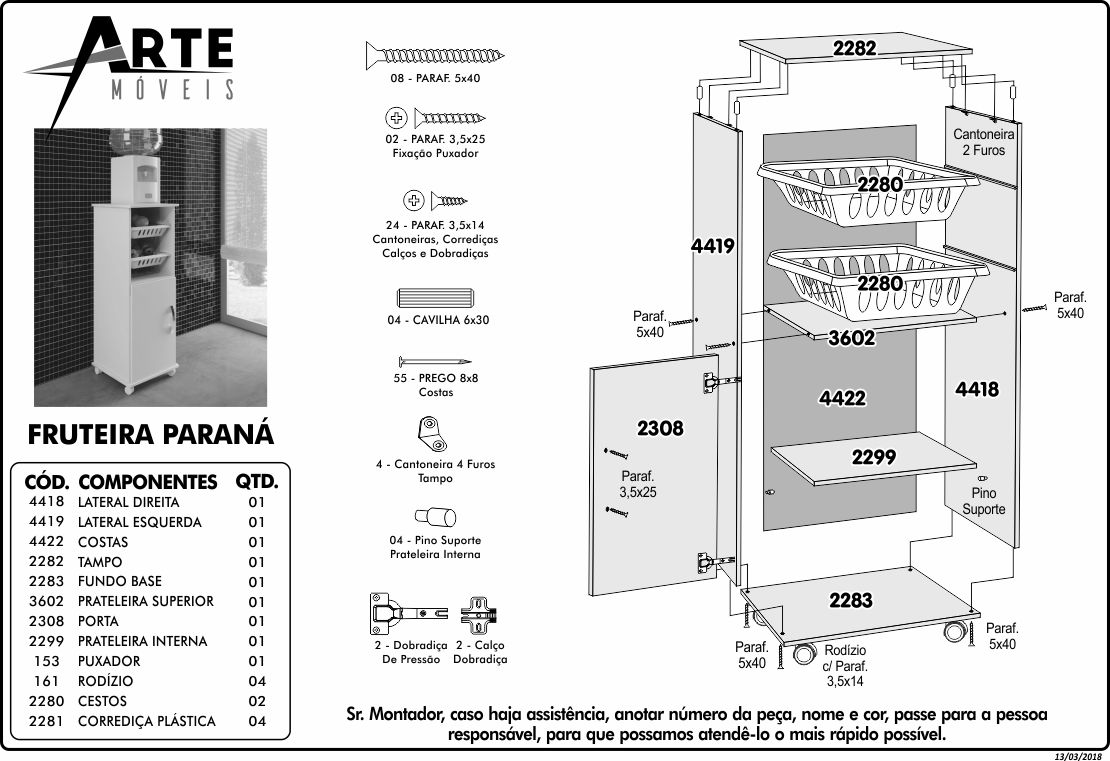 A Fruteira Paraná é prática e versátil, pois tem um design compacto e multifuncional. Conta com 02 cestos de plásticos removíveis para você colocar as frutas e legumes. Os pés são em rodízios possibilitando mover para todos os lugares. Possui uma porta e uma prateleira o que faz da organização de objetos, condimentos e utensílios muito mais prática. Observações: |