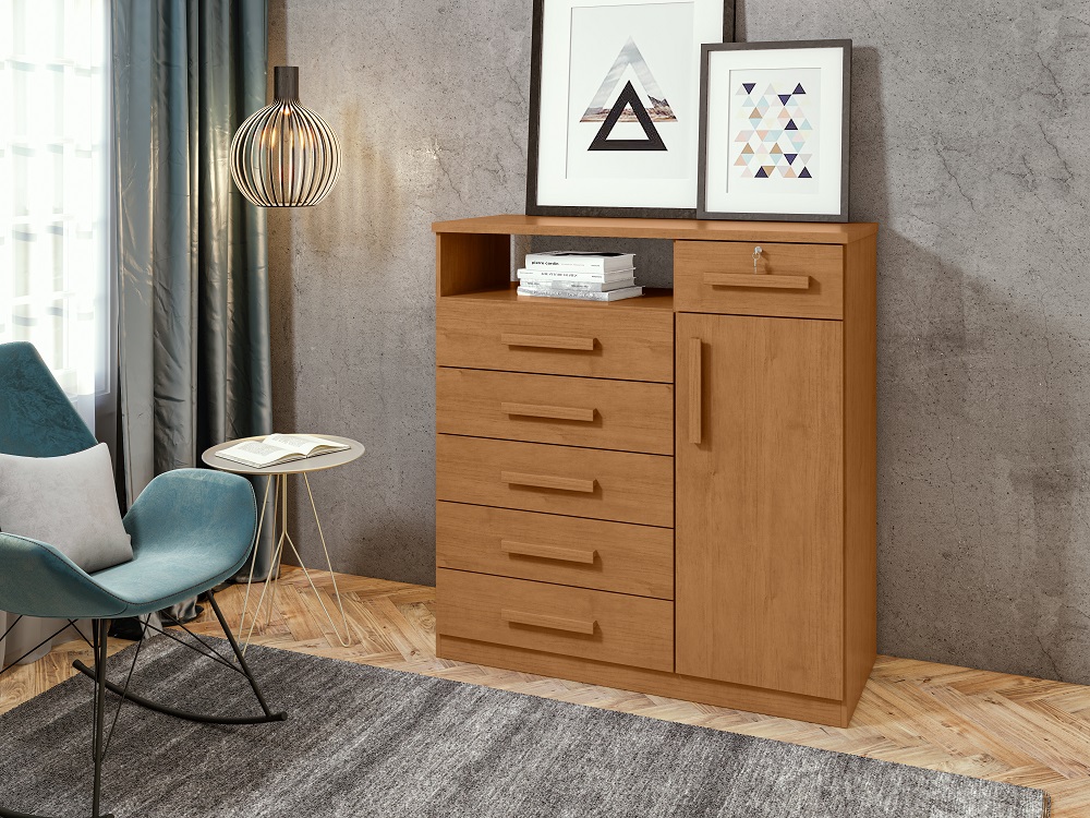 Produto em MDP; Pintura U.V. e acabamento em micro textura; Puxadores em MDF; 06 gavetas; Gaveta com chave; Gavetas com corrediças telescópicas; 01 porta com prateleiras internas; Tampo de 25mm; Fundo das gavetas e costas em HDF. Vantagens/Benefícios: Produzido com equipamentos de alta tecnologia; Produto avaliado e aprovado por um rigoroso controle de qualidade; Fácil montagem e manual de montagem simplificado; Design minimalista; Acabamento com toque aveludado; Gavetas ideais para acomodação das roupas em maiores quantidades; Gavetas grandes e espaçosas com corrediças telescópicas; Tampo de 25mm para maior resistência; Porta com puxador para melhor acesso às prateleiras internas; Prateleiras internas para sapatos.