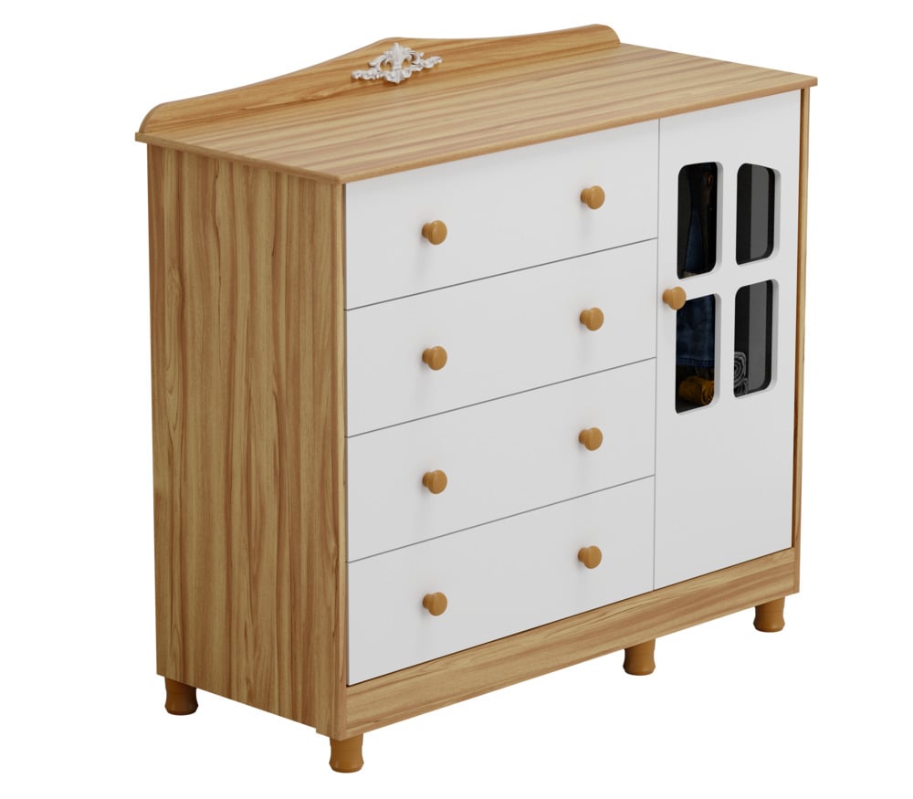 A cômoda infantil tem estilo provençal e apresenta uma estrutura resistente em 100% MDF com acabamento em Pintura UV atóxica, priorizando a segurança de toda família. Possui cabideiro metálicos, 4 gavetas com corrediças telescópicas para facilitar o acesso e 1 porta com janela em PETG cristal/acrílico, permitindo a visibilidade do interior. Os pés e puxadores em plástico garantem durabilidade e facilidade de manutenção, enquanto seu design cria um ambiente elegante e funcional no quarto dos pequenos.