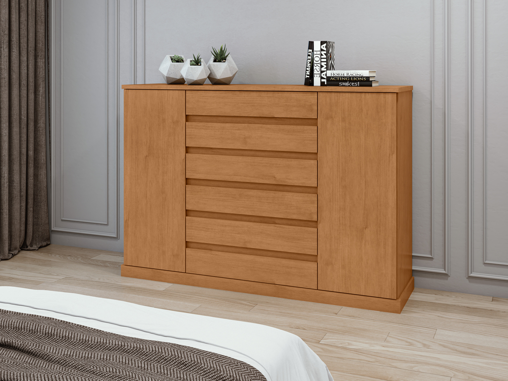 Produto em MDP; Fecho toque nas portas; Tampo de 25mm; 07 gavetas; Gavetas com corrediças telescópicas; 01 gaveta interna com chave; 02 portas com 05 nichos internos; Cabideiro em alumínio; Fundo das gavetas e costas em HDF. Vantagens/Benefícios: Produzido com equipamentos de alta tecnologia; Produto avaliado e aprovado por um rigoroso controle de qualidade; Fácil montagem e manual de montagem simplificado; Design minimalista; Gavetas ideais para acomodação das roupas em maiores quantidades; Acabamento com toque aveludado; Tampo de 25mm para maior resistência; Prateleiras internas para sapatos; Portas que se abrem facilmente; Gavetas grandes e espaçosas com corrediças telescópicas.