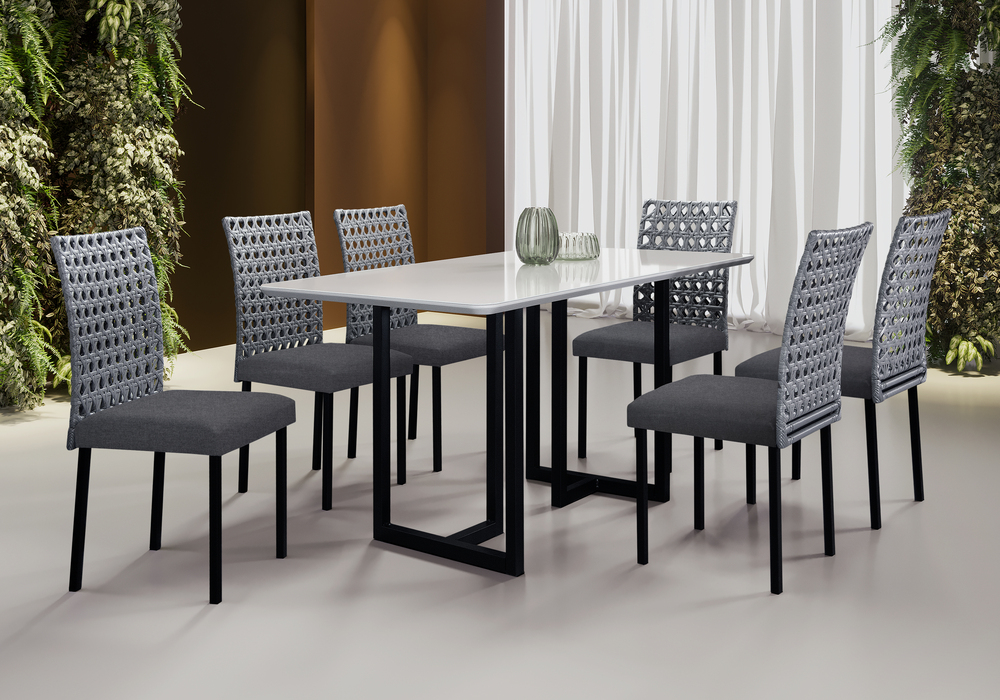O Conjunto Lisboa traz um design moderno e sofisticado, destacando o acabamento em Ratan trançado, que confere charme e leveza ao ambiente. Ideal para salas de jantar que valorizam estilo e praticidade.