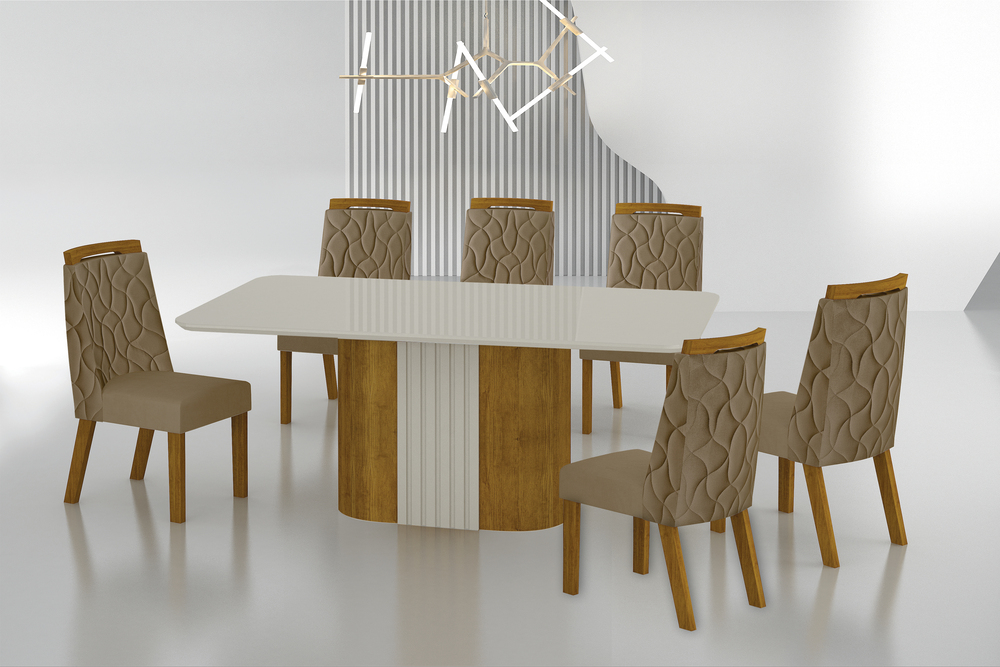 Quantidade de Cadeiras: 6 Quantidade de Lugares: 6 Medida da Cadeira (A x L x P): 97,5x44x59 cm Peso da Cadeira: 9,1 kg Estrutura do Assento: MDF Enchimento do Assento: Espuma D-20 Encosto: Estofado Cadeira/Banco Estofada: Encosto e Assento Estofados Cadeira/Banco Suporta Até: 120 kg Revestimento da Cadeira: Veludo Material da Estrutura da Cadeira: MDF Acabamento da Cadeira/Banco: Pintura UV Possui Apoio para os Pés: Não