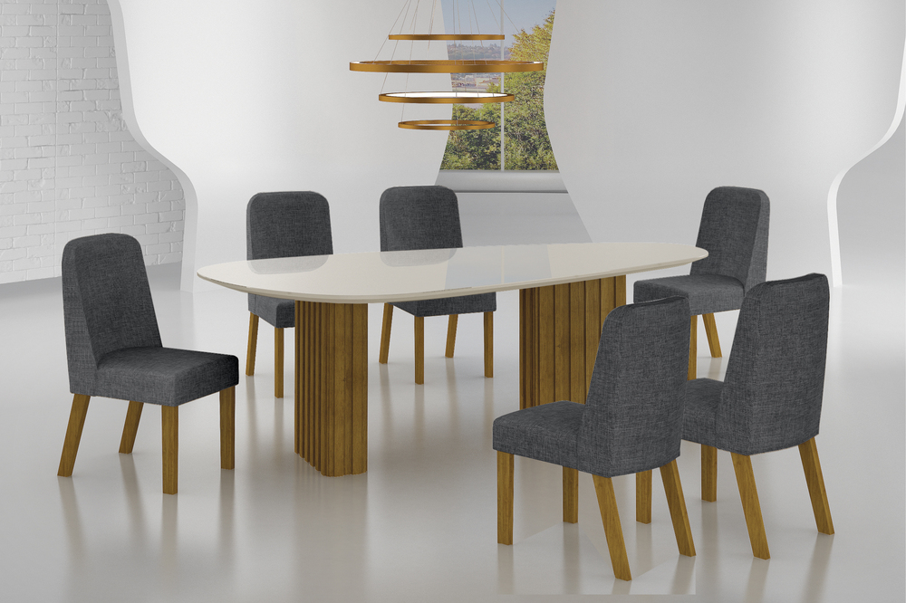 Conjunto sala de jantar mesa Isis 180cm com tampo orgânico sem vidro, 6 cadeiras Isis com assento e encosto estofados, detalhe da base ripado, dimensões da mesa: Altura: 75cm Largura 90cm, comprimento: 180cm, com esse conjunto de sala de jantar sua sala irá ficar ainda mais linda e elegante.