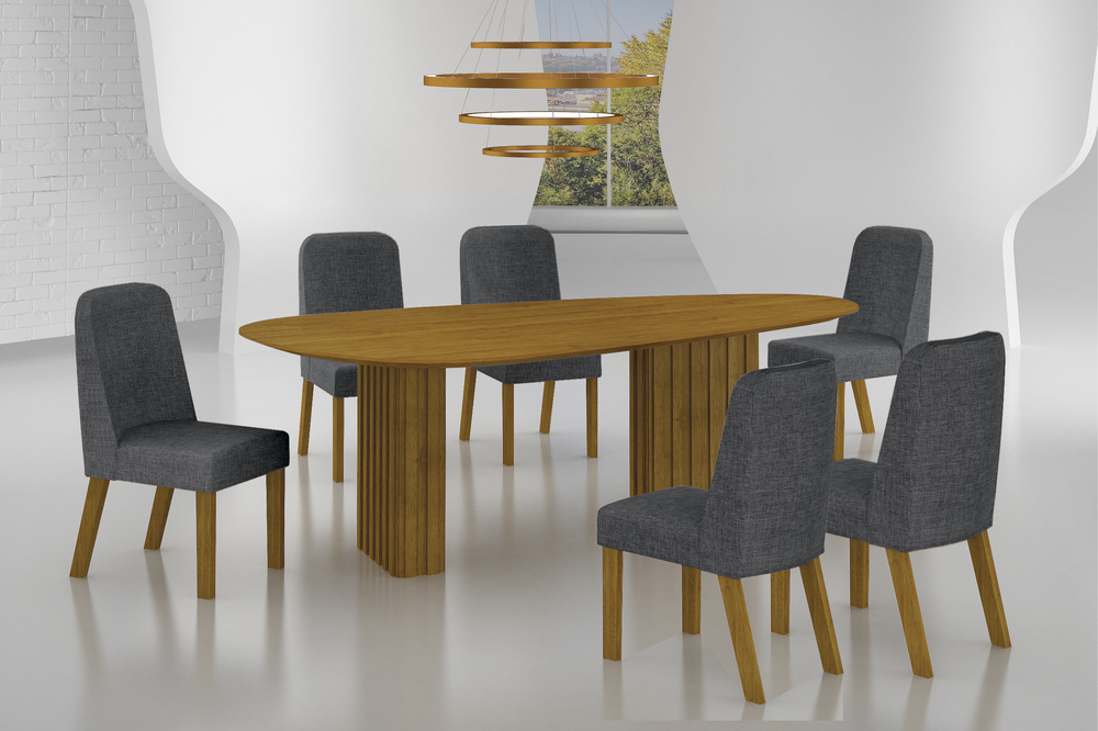 Conjunto sala de jantar mesa Isis 180cm com tampo orgânico sem vidro, 6 cadeiras Isis com assento e encosto estofados, detalhe da base ripado, dimensões da mesa: Altura: 75cm Largura 90cm, comprimento: 180cm, com esse conjunto de sala de jantar sua sala irá ficar ainda mais linda e elegante.