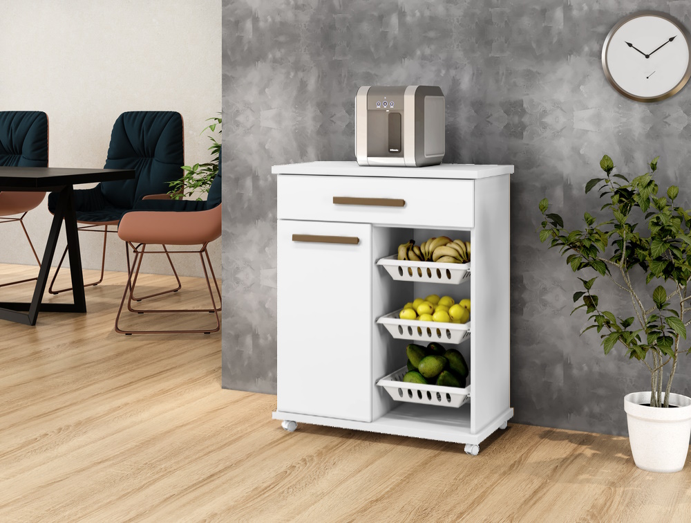 Que tal dar mais vida a sua cozinha com este belíssimo balcão com fruteira. Prático e funcional, possui tampo super resistente. Ampla gaveta com corrediça metálica. Prateleira interna removível para dar ainda mais espaço. Cestos de plástico muito mais higiênicos. Rodinhas para facilitar a locomoção durante a limpeza. Design belíssimo. Acabamento: Pintura UV Acabamento da Gaveta: Pintura UV Acabamento da Porta: Pintura UV Acabamento da Prateleira: Pintura UV Acabamento dos Pés: Liso : 89 cm : 89 cm dos Pés: 6 cm Ambiente: Cozinha Cesto para Frutas: 03 Cesto Removível: Sim Complexidade da Montagem: Baixa: pode ser montado por uma pessoa sozinha Cor Interna: Branco Escala de Brilho: Semi-Brilho Escala de Brilho da Gaveta: Semi-Brilho Escala de Brilho da Porta: Semi-Brilho Escala de Brilho da Prateleira: Fosco Estilo: Clássico Gaveta com Chave: Não Itens Inclusos: 1 Balcão fruteira, 1 jogo de cestos, 1 manual de montagem, 1 kit de montagem : 73 cm : 73 cm Material da Gaveta: MDP Material da Porta: MDP Material da Prateleira: MDP Material do Cesto: Plástico Material do Puxador da Gaveta: Cromado Material do Puxador da Porta: Cromado Material dos Pés: Plástico Material Principal: MDF/MDP Montagem Flex: Gaveta dupla face. Duas opções de montagem Necessita Montagem: Sim Peso: 27,3 kg Peso Máximo por Gaveta: 3 kg Peso Máximo por Prateleira: 5 kg Possui Pés: 04 Possui Portas: 01 Possui Rodízio: Sim : 39 cm : 39 cm Recomendações de Uso, Manutenção e Limpeza: Limpar com pano seco ou levemente umedecido em água. Não usar produtos abrasivos Rodízio com Trava: Não Sapatas Niveladoras: Não Sistema de Montagem: Parafusos, cavilhas, cantoneiras, pregos Suporta até (kg): 40 kg Tipo de Corrediça da Gaveta: Metálica Simples Tipo de Dobradiça/Corrediça da Porta: Metálica Tipo de Porta: Bater Tipo de Puxador da Gaveta: Externo Tipo de Puxador da Porta: Externo Observações: - Todos os produtos têm três (03) meses de garantia fornecida pelo fornecedor - As imagens são meramente ilustrativas, os objetos que ambientam as fotos não acompanham o produto. - Pode haver alguma diferença de tonalidade entre a foto e o produto, devido ao tratamento de imagens e a calibração do monitor - A entrega é realizada por transportadora, não nos responsabilizamos, no ato da entrega por desmontagens, subir escadas/elevadores ou transporte por guincho para apartamentos - Eventuais despesas são de responsabilidade do cliente - Confira as dimensões dos volumes e certifique-se de que passará normalmente por supostos elevadores, portas, escadas ou corredores - Ao receber a mercadoria, verifique as condições da embalagem, caso haja alguma avaria, entre em contato com nosso SAC - Nossa empresa não se responsabiliza pela montagem dos produtos, mas todos os produtos possuem manual de montagem. Recomendamos que a montagem seja feita por profissional de sua confiança.
