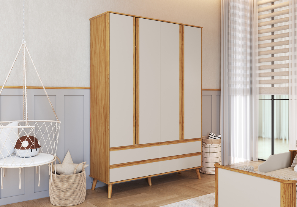 O Armário Theo 4 Portas Lisas é um produto 100% MDF e possui pintura atóxica. Seu caixote é em chapa de 12 mm, enquanto as frentes, base e tampos são em chapa de 15 mm de espessura. Seus pés palito são madeira maciça com regulage em altura. Os puxadores tipo cava são fabricados em MDF revestido com papel melamínico. Possui cabideiro metálico, gavetas com corrediças telescópicas e portas com dobradiça slow motion.