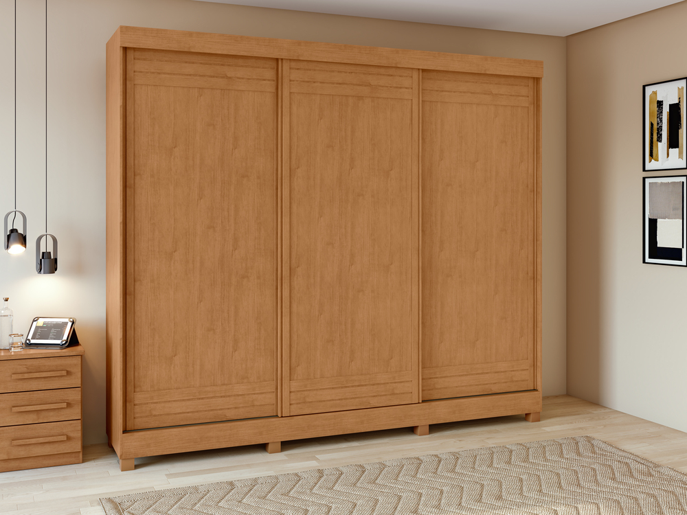 Produto em MDP com chapas de 15mm; Pintura U.V. e acabamento em micro textura; Encabeçamento das portas em MDF de 25mm; 03 portas dupla face; Interno diferenciado com 08 prateleiras; Maleiro individual; Gavetas com corrediças telescópicas; Gavetas com distanciadores em MDF; Cabideiros em alumínio; Espaço para sapatos. Vantagens/Benefícios: Produzido com equipamentos de alta tecnologia; Produto avaliado e aprovado por um rigoroso controle de qualidade; Fácil montagem e manual de montagem simplificado; Kits e acessórios vendidos separadamente, dando maior flexibilidade para o produto; Acabamento com toque aveludado; Excelente profundidade, possibilitando amplo espaço interno para organização; Gavetas grandes e espaçosas com corrediças telescópicas; Distanciador de gavetas em MDF, dando a elas maior durabilidade; Portas dupla face que permitem que o consumidor escolha a cor antes da montagem; Moldura com design moderno que traz charme, resistência e durabilidade; Interno do produto da mesma cor do externo.