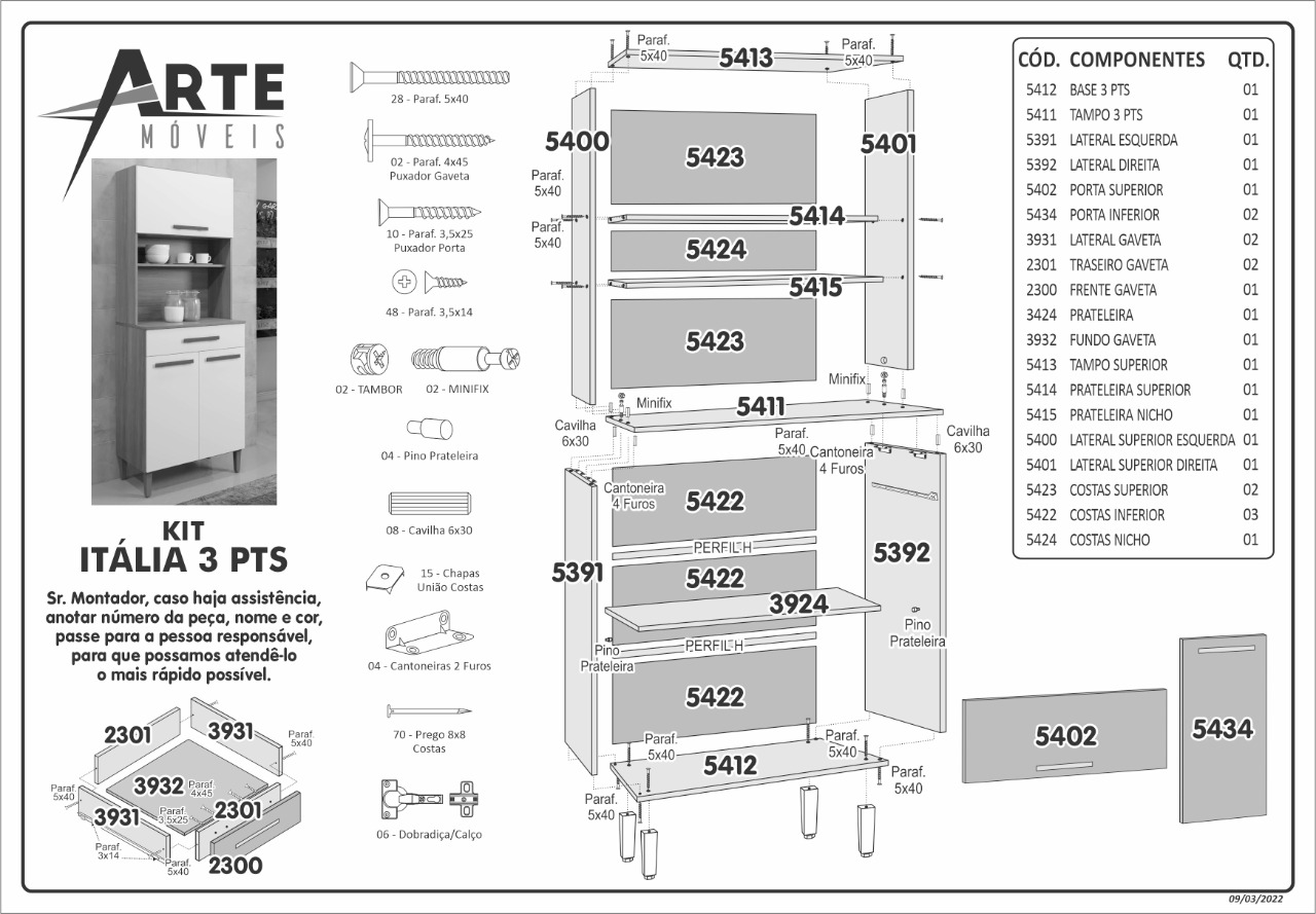 Kit Cozinha Itália 03 Portas e 01 Gaveta Arte Móveis