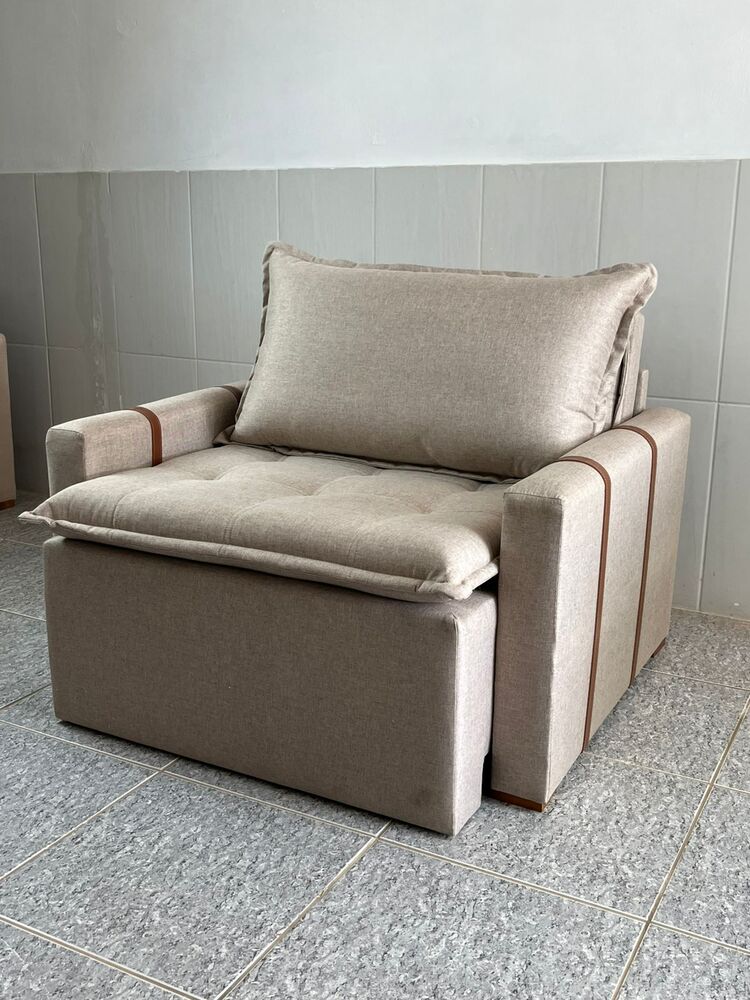 Seu estofamento em espuma de alta densidade proporciona uma experiência acolhedora e relaxante, enquanto os detalhes em couro sintético e costura aparente agregam charme e elegância à decoração. A estrutura robusta em madeira garante durabilidade e segurança no uso diário.